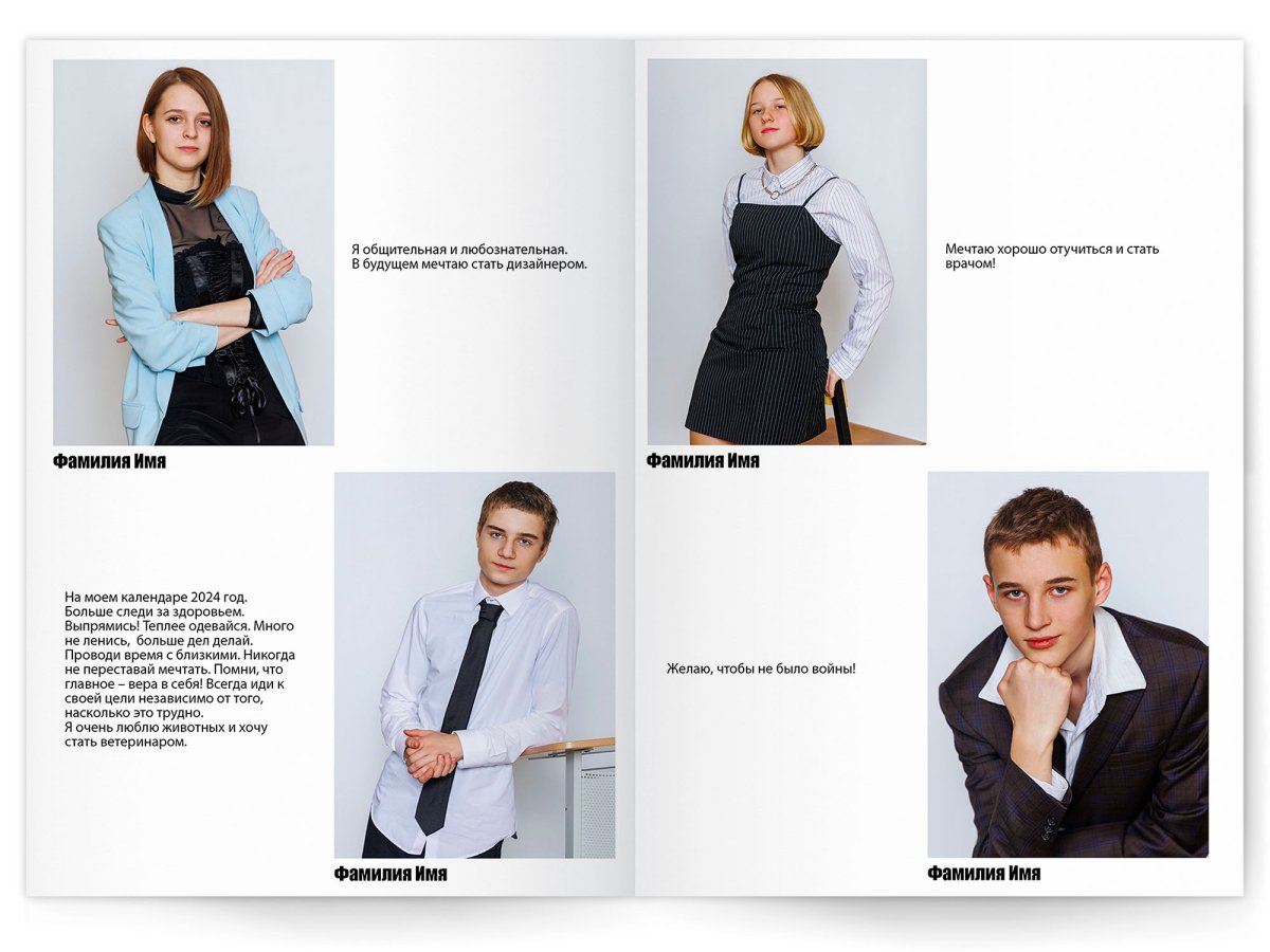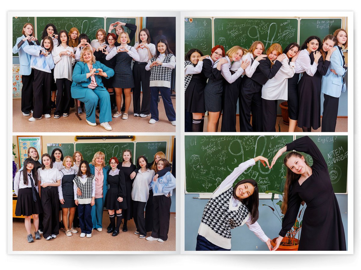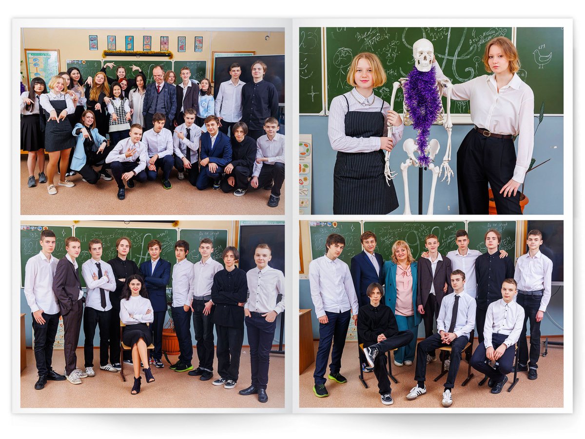• Портреты всех одноклассников и все учителя, которые придут на съёмку на развороте