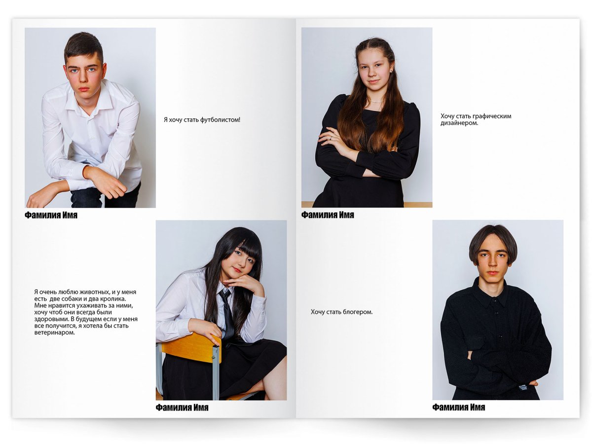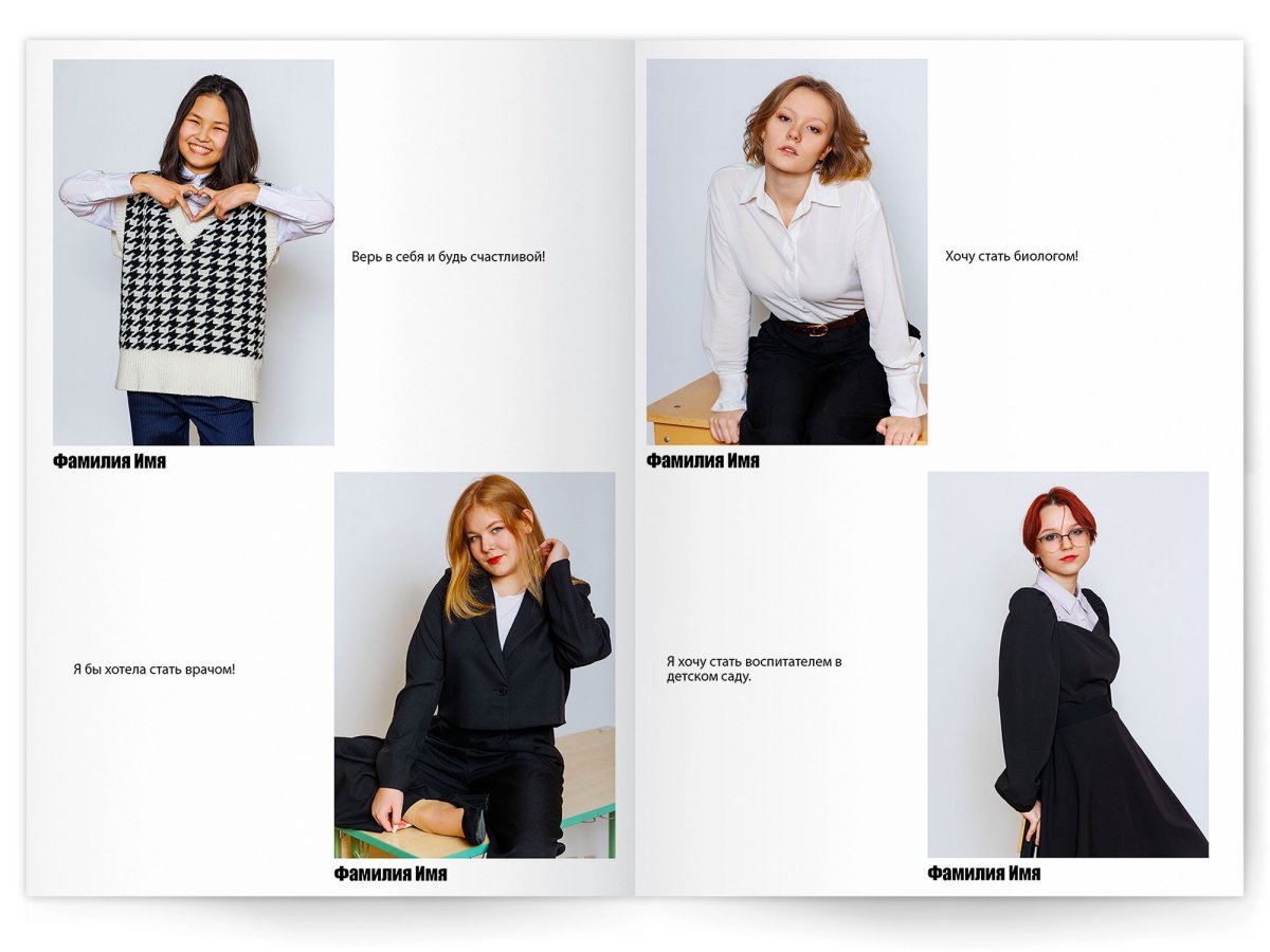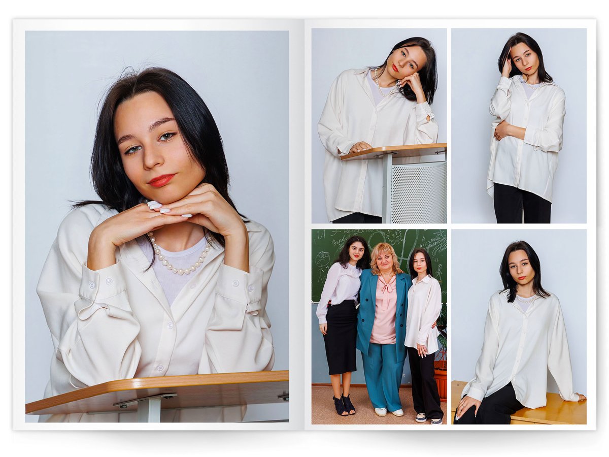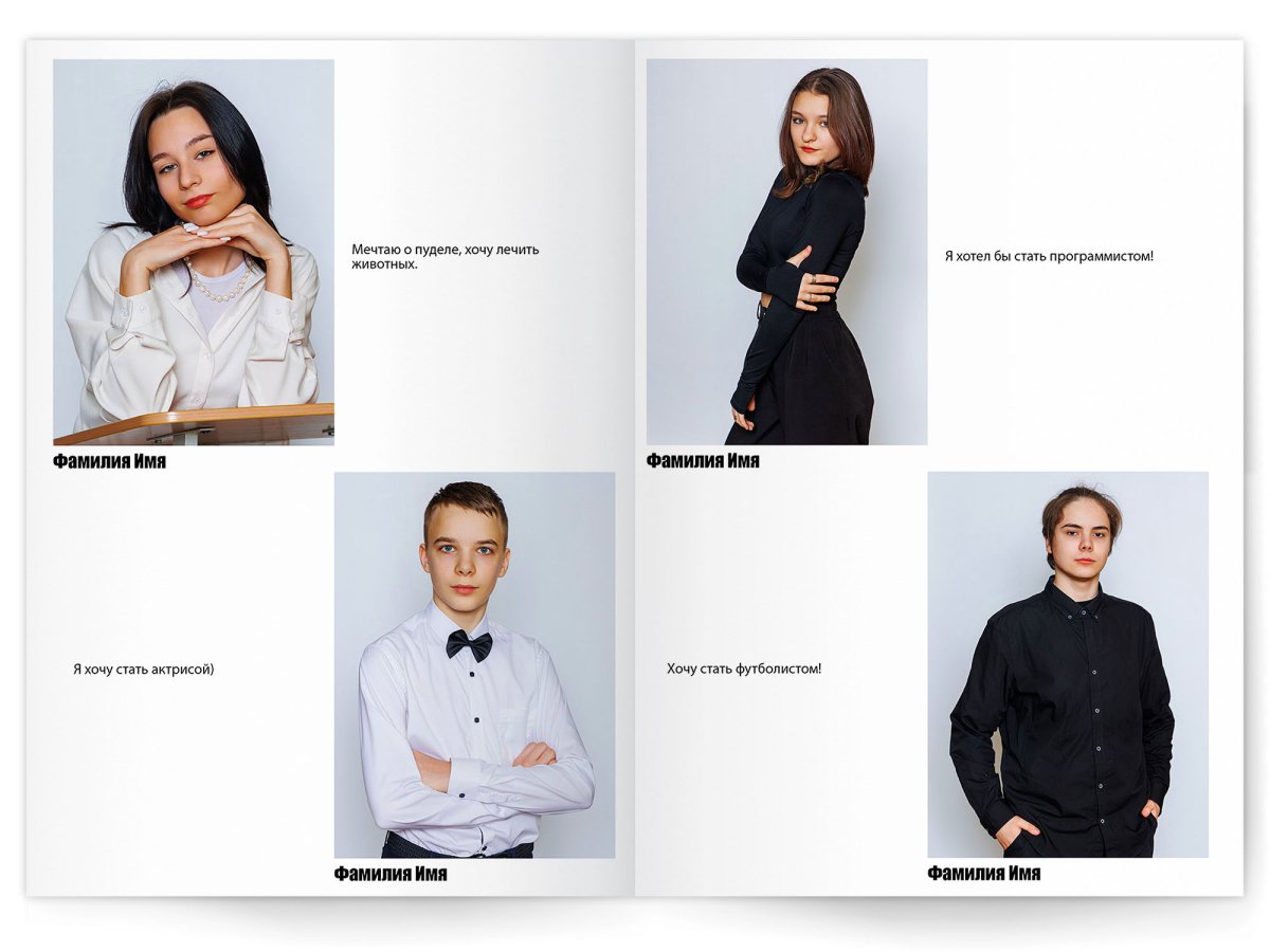 • Портреты всех одноклассников и все учителя, которые придут на съёмку на развороте